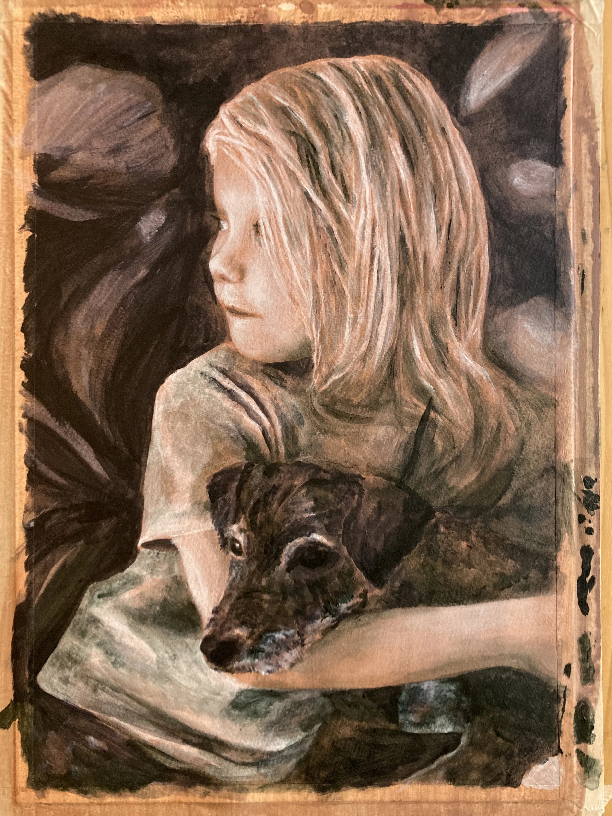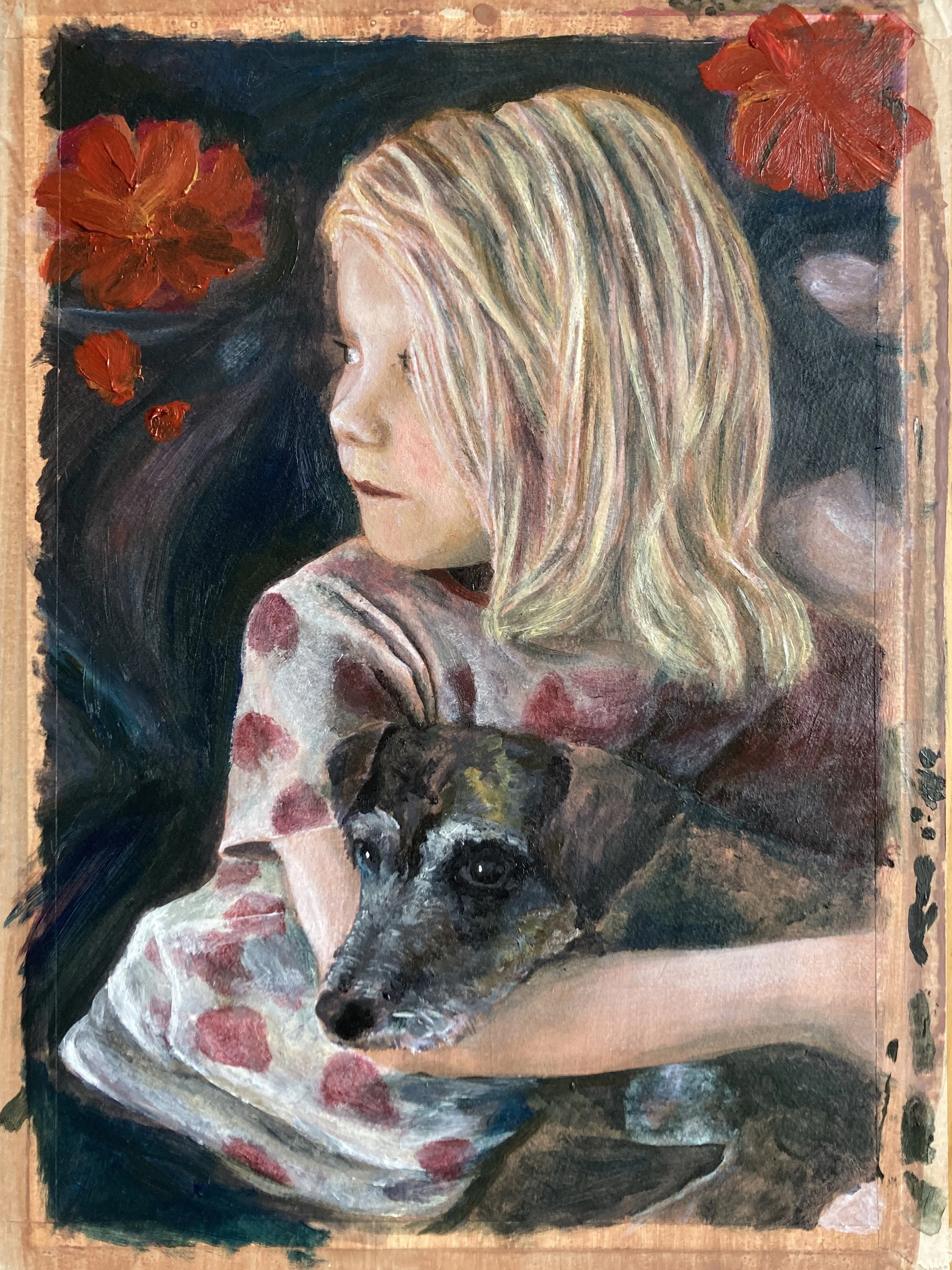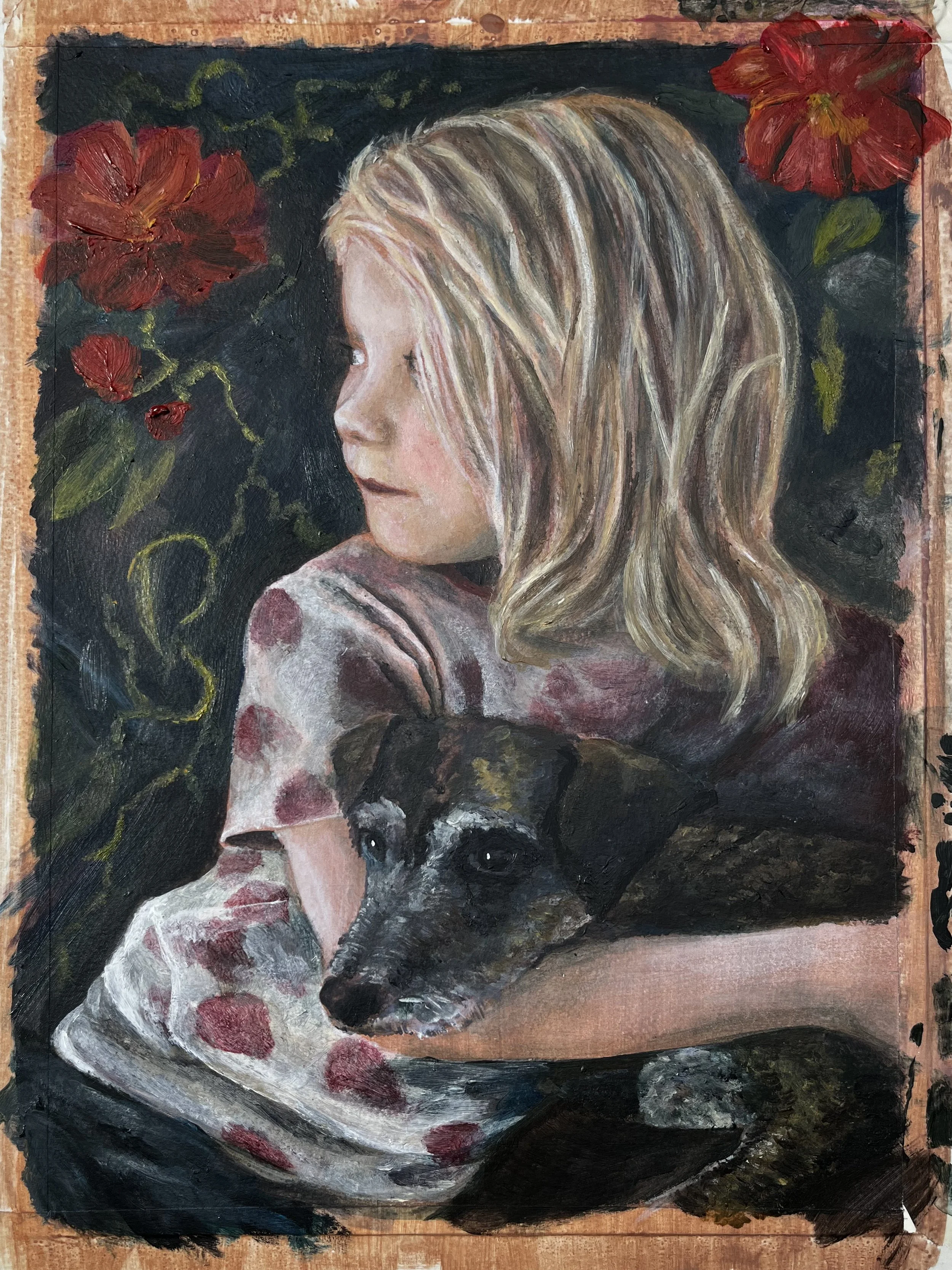 I took up painting again during the writer and actor strikes in 2023. My first personal project was a gift for the mother of the Ukrainian family that was living with my parents. I had particularly bonded with the youngest daughter of the family and painted her holding my little dog.